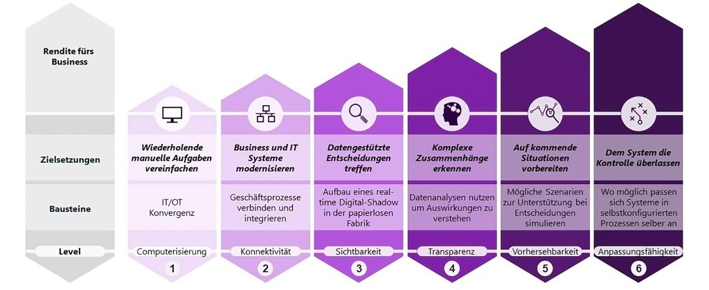 Eine Modernisierung nach dem Vorbild einer Industrie 4.0 muss mit dem beginnen, was vor Ort an Software und Betriebssystemen verfügbar ist. Ähnlich der Darstellung des Industrie 4.0 Maturity Centers in Aachen (Seite 23) verfolgt der Anbieter von industrieller Software Aveva den Ansatz, dass eine klare Strategie hilft, die passende Technologie auszuwählen und einzusetzen. Organisationen müssen wissen, wo sie stehen und einen Plan entwickeln, wohin sie wollen. Dann lässt sich unter Berücksichtigung der Komponenten des Automation Maturity Model eine Strategie entwickeln, diese Ziele auch zu erreichen.