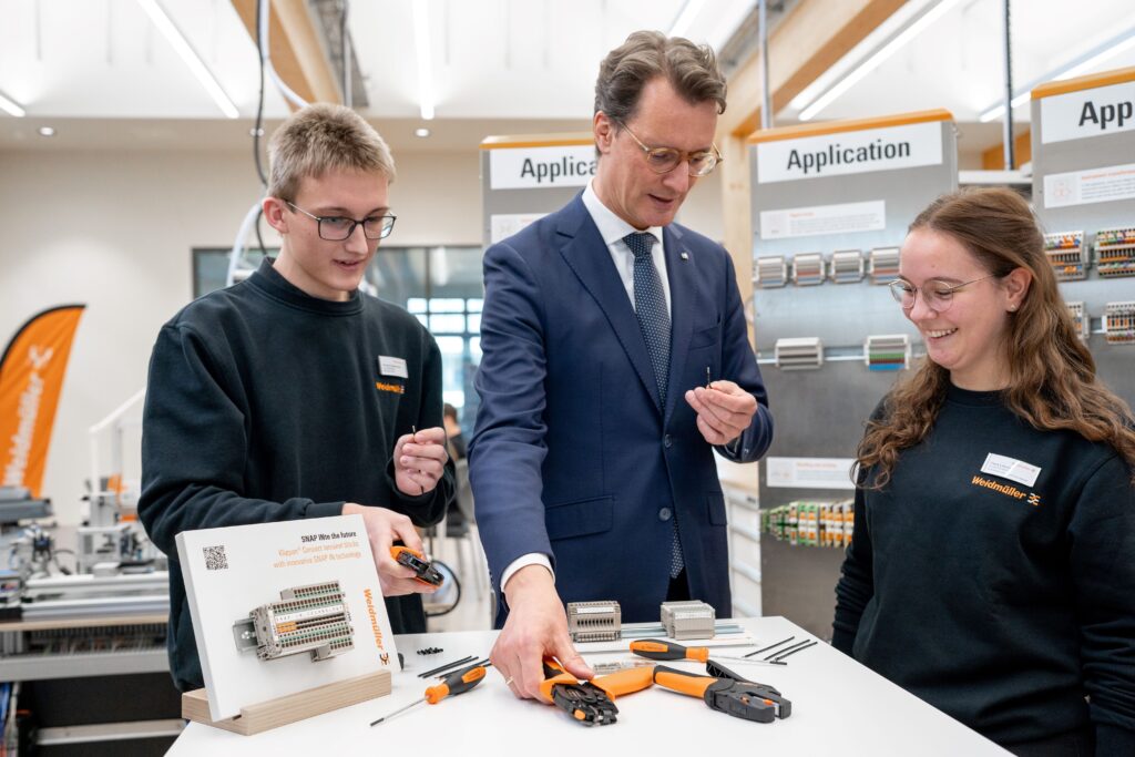 Bild: Weidmüller GmbH & Co. KGDer Ministerpräsident des Landes Nordrhein-Westfalen, Hendrik Wüst, besuchte das Elektro- und Verbindungstechnikunternehmen Weidmüller in Detmold. Im Fokus seines Besuchs standen Investitionen des Unternehmens in die Ausbildung junger Talente und die Errichtung einer hochmodernen Elektronikfertigung.