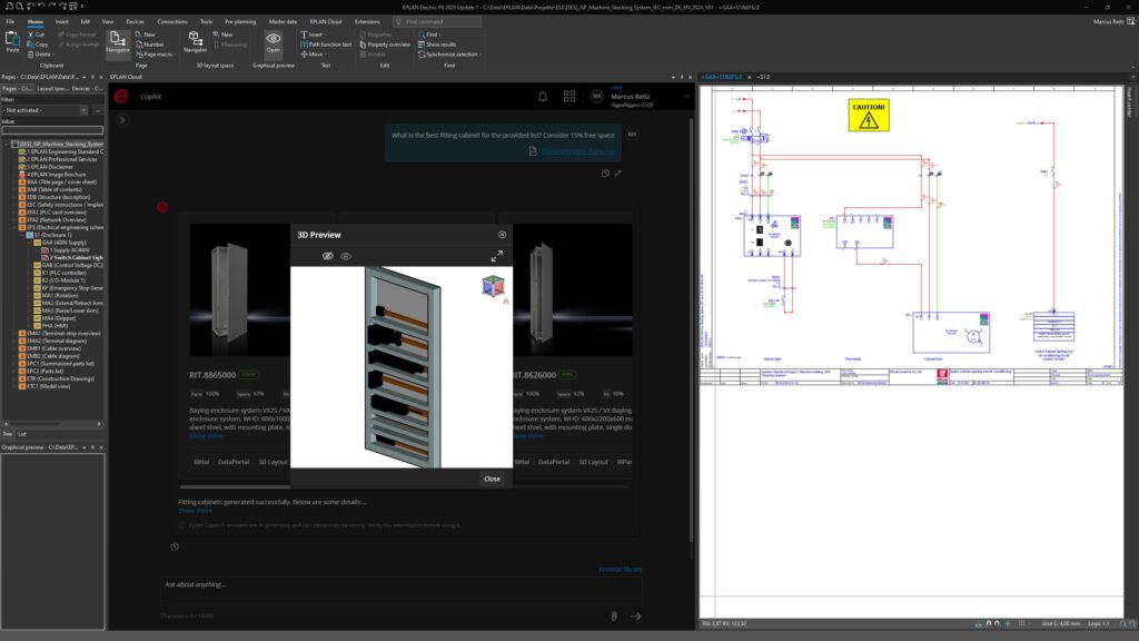 Auf Basis einer definierten Stückliste wird die KI per Prompt aufgefordert, einen Entwurf für das 3D-Montageplatten-Layout zu generieren. Die Auswahl des passenden Schaltschranks bzw. der Montageplatte wie auch die notwendigen Kabelkanäle, Hutschienen und Komponenten werden dabei vom System berücksichtigt. Der Anwender weiß sofort, welcher Schrank zu welchem Projekt passt und die KI generiert in wenigen Sekunden - sozusagen auf Knopfdruck - das passende Layout. Nach Schätzung der Eplan-Experten liegen hier Zeiteinsparungspotenziale von bis zu 40 Prozent.