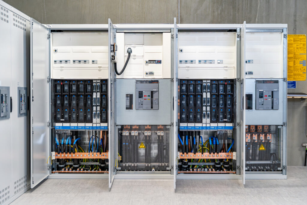 Die Energieversorgung des Logistikzentrums in Schwaig erfolgt über vier Mittelspannungstransformatoren. Eine zentral installierte Niederspannungshauptverteilung stellt die Energieverteilung für die fünf Hallenbereiche sowie die angeschlossene Sprinklerzentrale sicher. Zum Einsatz kommt an dieser Stelle das modulare Energieverteilungssystem Unimes H von Hager. Es zeichnet sich durch eine klare Struktur, einfache Installation und hohe Wartungsfreundlichkeit aus. Die Anlage erfüllt hohe Anforderungen an Anlagensicherheit und -verfügbarkeit - ergänzt durch geprüfte Kurzschlussfestigkeit sowie Erdbeben- und Schockbeständigkeit. Ausgelegt für Betriebsströme bis 4.000A bietet Unimes H eine zukunftssichere Lösung für industrielle Anwendungen.