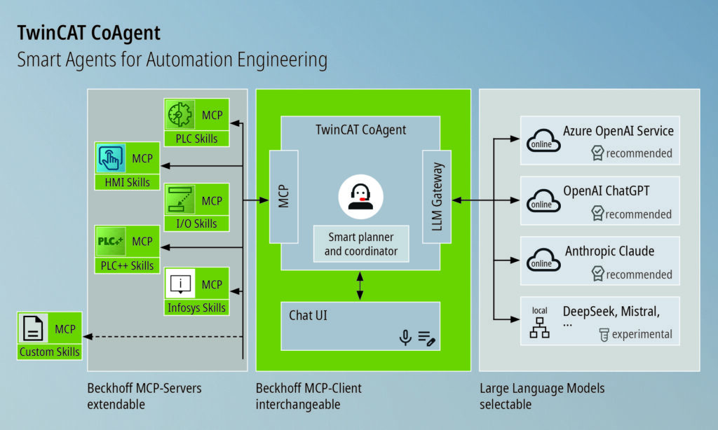 Twincat CoAgent von Beckhoff erweist sich damit als leistungsfähiger KI-Assistent über den gesamten Automatisierungs-Lifecycle - von der Code-Generierung im Engineering bis zur Fehlerdiagnose im laufenden Betrieb. Die offene Architektur des Twincat CoAgent ermöglicht die Anbindung unterschiedlicher Sprachmodelle und die flexible Kombination mit kundenspezifischen Erweiterungen - unterstützt durch Schnittstellenstandards wie das Modular Concept Protocol (MCP). So kann ein Unternehmen beispielsweise eine eigene Wissensdatenbank als MCP-Server bereitstellen und diese nahtlos in den CoAgent integrieren. Durch die Produkt- Erweiterung auf den kompletten Lifecycle lassen sich Entwicklungs- und Serviceprozesse gleichermaßen beschleunigen, Komplexitäten reduzieren und Stillstandszeiten deutlich verkürzen. So profitieren Entwickler von mehr Effizienz und Freiraum im Projektalltag, während Service-Teams schneller reagieren können und gezielt unterstützt werden. Die erhöhte Flexibilität und Offenheit des Systems sorgt zugleich für Investitionssicherheit und Zukunftsfähigkeit.