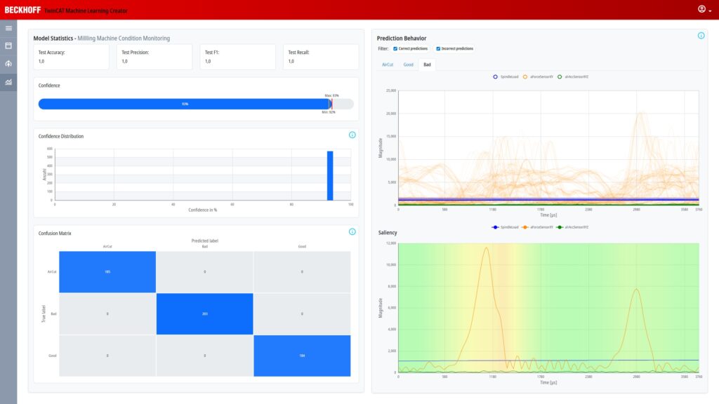 Das mit Twincat MLC automatisch trainierte Modell kann im offenen Standardformat ONNX exportiert werden und ist hinsichtlich Latenz und Genauigkeit optimal an die Echtzeitanforderungen im Steuerungsumfeld angepasst. Der bisherige Schwerpunkt lag dabei auf KI-gestützter Bildverarbeitung. Mit Twincat MLC Signals and Time Series erweitert Beckhoff den Funktionsumfang des Machine Learning Creator: Neben der Bildverarbeitung (Twincat MLC Computer Vision) lassen sich nun auch Signale und Zeitreihen effizient analysieren. Typische Anwendungsfälle sind: