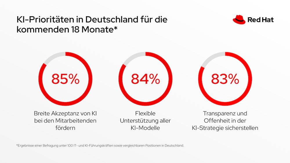 Bild: Red Hat GmbHRed Hat hat eine neue Studie im Bereich künstlicher Intelligenz durchgeführt. Auf die Frage nach der IT-Strategie ihres Unternehmens für die nächsten 18 Monate geben 80% der Befragten in Deutschland an, dass die digitale Souveränität eine Top-Priorität ist, gefolgt von Sicherheit (79%) und Hybrid- oder Multi-Cloud (78%). 74% räumen zudem der KI einen hohen Stellenwert ein: Die Ergebnisse zeigen, dass deutsche Unternehmen bis 2026 eine Steigerung ihrer Investitionen in KI um durchschnittlich 34% erwarten. Allerdings geben 85% der befragten Unternehmen an, dass sie noch keinen Kundennutzen aus ihren KI-Investitionen ziehen.Der gleiche Anteil sagt, dass die Förderung der breiten Akzeptanz durch die Mitarbeitenden die höchste Priorität hat.