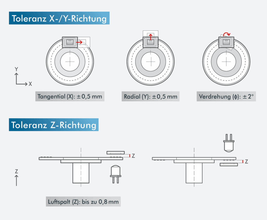 Der iC-RT2624 verfügt über einen großzügigen Arbeitsbereich und kann tangential und radial innerhalb von ±0,5mm gegenüber der Codescheibe montiert werden. Zusätzlich sind ±2° Verdrehung tolerierbar. Dies ermöglicht prozesssichere Abläufe bei der Gebermontage, ohne dass eine aufwändige Justierung des Sensors erforderlich ist. Die automatischen Abgleichfunktionen des Chips stellen präzise Messergebnisse innerhalb des gesamten Arbeitsbereichs sicher und können wahlweise per seriellem Kommando über Biss und SPI oder auf Knopfdruck ausgeführt werden. Letzteres ermöglicht die Inbetriebnahme binnen Sekunden im Feld und eignet sich deshalb besonders für Kit-Encoder, die erst beim Endkunden in die Anwendung eingebaut werden. Dabei sind keine zusätzlichen Hardware- oder Software-Tools für die Erstinbetriebnahme nötig.