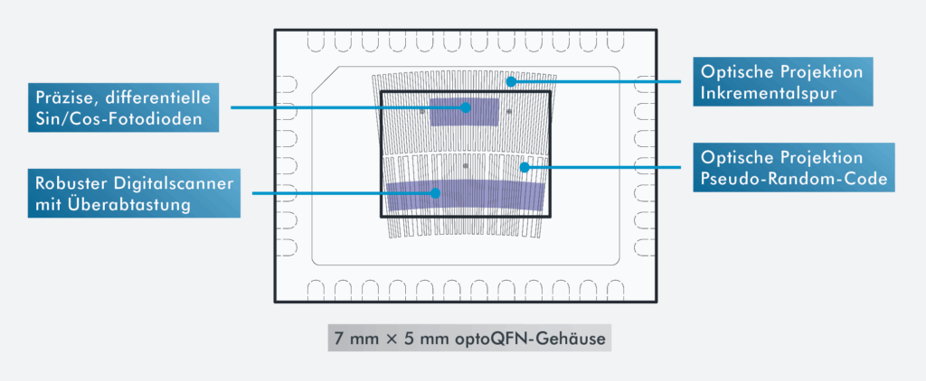 Der komplexe Schaltkreis des iC-RT2624 ist in einem kompakten 7x5x0,9mm kleinen optoQFN-Gehäuse mit 38 Pins untergebracht und wird mit einer Versorgungsspannung von 3,0 bis 5,5V betrieben. Eine gegenüber der Gehäuseoberseite angeordnete LED durchstrahlt eine dazwischenliegende Codescheibe. Zwei optische Spuren, die z.B. in Form von Chromstrukturen auf der Scheibe aufgebracht sind, projizieren die Winkelinformation als Schattenwurf auf das Sensorfenster.