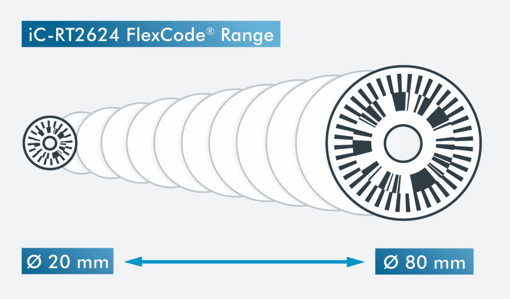 Dank FlexCode können die Maße der Codescheibe ab einem Außendurchmesser von 20mm nahezu frei gestaltet werden. So lässt sich ein Encoder-System mit dem iC-RT2624 in unterschiedlichste Bauformen und Platzverhältnisse integrieren. Unabhängig von der verwendeten Codescheibe und der damit verfügbaren Basisauflösung, die durch die Strichzahl und Teilungsperiode festgelegt ist, kann die Auflösung für alle Ausgabeschnittstellen individuell eingestellt werden. Der ABZ-Generator mit programmierbarer Quadraturauflösung ist bei Encoder-Produkten von iC-Haus bereits fest unter dem Begriff FlexCount etabliert. Auch die Datenlänge des Positionsworts der seriellen Schnittstellen Biss/SSI und SPI kann vom Anwender frei eingestellt werden.
